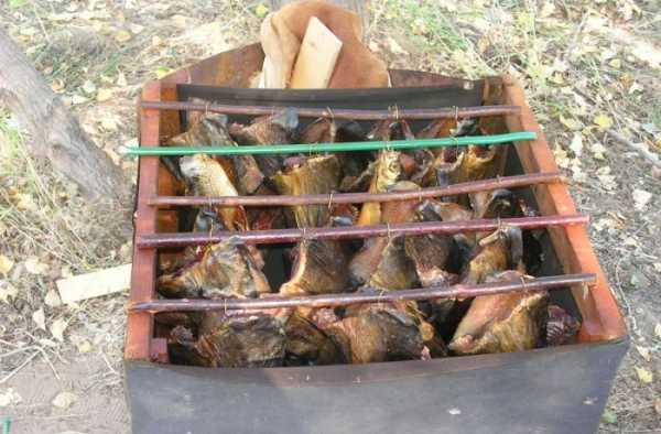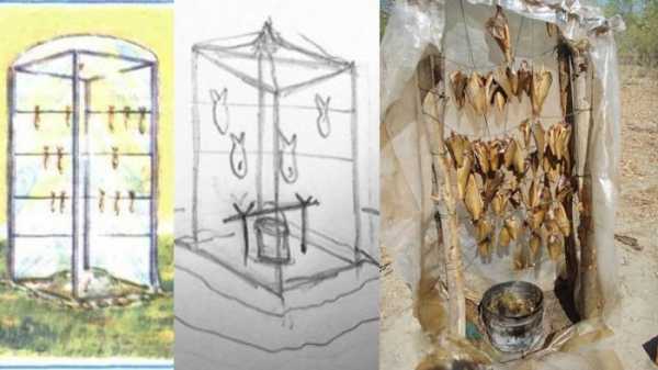 Самое простое походное устройство. Нужен лист кровельного железа и старый эмалированный бак, в котором необходимо проделать несколько отверстий. Также нужно сделать решетку по диаметру бака (типа сетки на теннисной ракетке) из проволоки и металлических стоек или приспособить металлическое сито на металлической же подставке. Если есть кирпичи, то между ними разводится огонь, а на кирпичи кладется лист железа, если кирпичей нет, то костер разводится в яме, а лист кладется на землю. На железный лист кладется та щепа или угли, которые и будут тлеть. Сверху ставится решето с рыбой или кусочками мяса, и вся конструкция накрывается дырявым баком. Если между листом железа и баком есть щели, то их присыпают песком или другим материалом.
