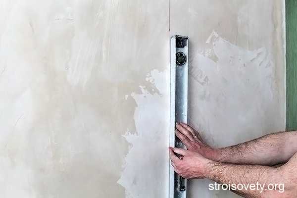 - С помощью уровня проведите вертикальную линию — ориентир для первого куска