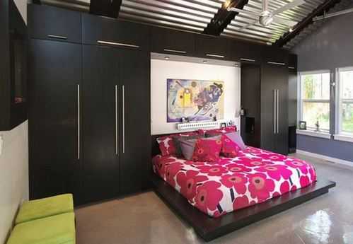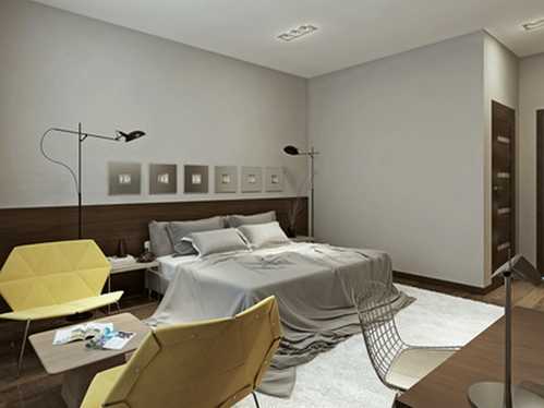 Их можно расположить по бокам, не препятствуя проходу. Можно отделить кровать от шкафа небольшим ярким ковриком, который будет привлекать к себе взгляд, визуально «раздвигая» тяжелые предметы.