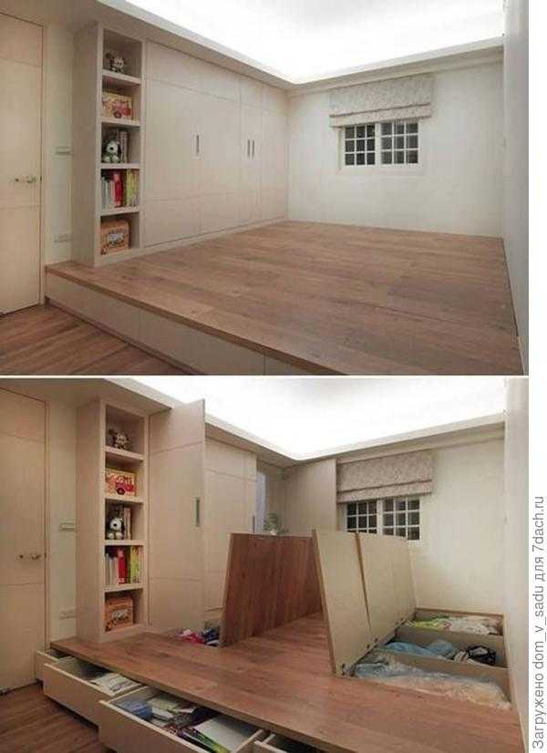 Чаще всего подиумы используют для зонирования пространства. А здесь они заменяют многочисленные антресоли, уродующие интерьеры. Вы будете буквально ходить по тайным местам для хранения.