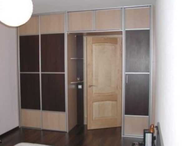 Этот вариант очень востребован для тех комнат, где дверной проем расположен с краю стены. Шкаф устанавливается от противоположного края этой стены и вплоть до проема. При такой планировке шкаф воспринимается как часть архитектуры комнаты. Проем углубляется, превращаясь в мини-тамбур, но это не вносит ощутимых неудобств.