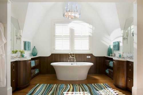 - Если есть желание применить такую палитру в оформлении ванной комнаты, тогда не стоит заполнять ею все помещение. Ванные, как правило, не отличаются просторными размерами, а темные тона сделают помещение еще меньше. Наиболее оптимальным вариантом будет оформление в цвете венге отдельных элементов. Например, оконные рамы или покрытие для пола.