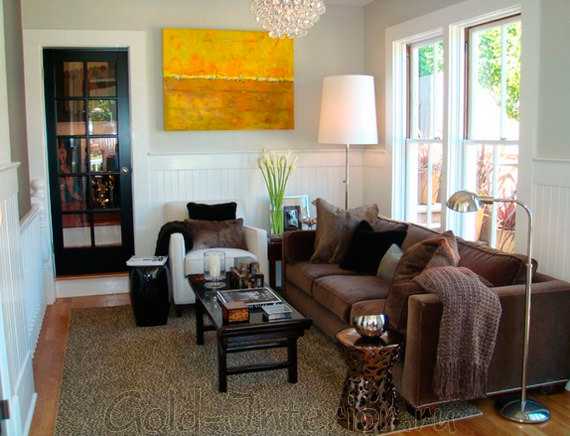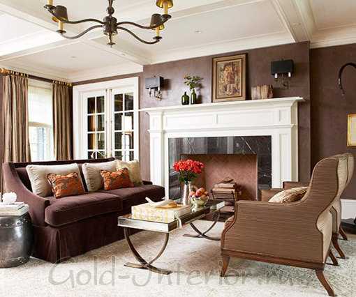 - Чтобы обстановка не стала выглядеть мрачно (а коричневый может оказать такое воздействие), очертите помещение белым контуром. Ковер, камин и дверные проемы здесь объединяются в одно целое с белоснежным потолком, делая интерьер более нежным и невесомым.