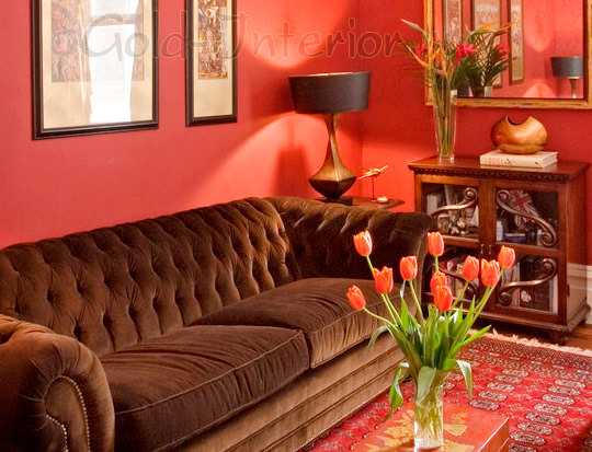 Очень энергичные и чувственные интерьеры получаются там, где темно-коричневый встречается с красным. Любые вариации на шоколадно-ягодную тему выглядят притягательно. А если использовать оба цвета в приглушенном выражении, то комната примет официальный и респектабельный вид. Такую смесь традиционно используют в помещениях, ориентированных на отдых – будуарах, спальнях, столовых. Если же усилить энергию терракотового, то интерьер станет располагать к активным действиям, в этой комнате можно обустраивать гостиную или рабочий кабинет.