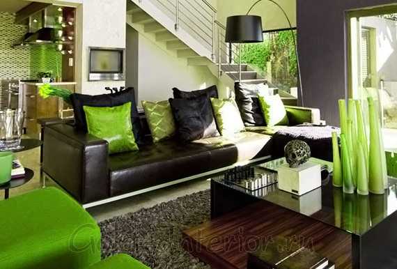 Венге – это цвет древесины, добываемой в Центральной Африке. Ее темный оттенок идеально подходит для создания всевозможных этнических интерьеров, строгих, но с нотками экзотики. Для разбавления темно-коричневого мы рекомендуем использовать сочные салатовые цвета, не имеющие ничего общего с привычными для нас болотными или еловыми оттенками. Лаймовый, грушевый, шартрез – вот какие подушки следует купить для дивана цвета венге в колониальном интерьере. Чтобы усложнить сочетание, смешивайте их с черными, как на иллюстрации ниже.