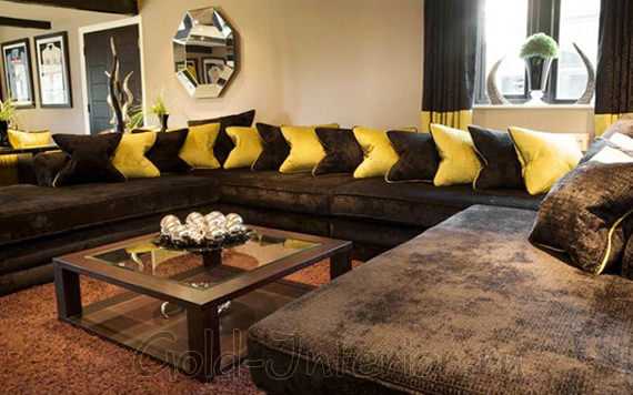 Сочетание желтого и коричневого – в целом, гармоничное, при условии правильного подбора оттенков. Для комбинации с диваном цвета венге нам понадобится нестандартный грязно-желтый, с горчичным или легким золотистым эффектом. Пример, представленный на фотографии ниже, довольно радикальный, не обязательно добавлять в комнату так много желтого, можно ограничиться двумя-тремя крупными подушками.