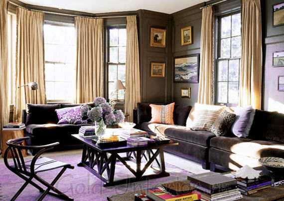 Если комбинация с серым цветом вам понравилась, обратите внимание на еще одно нетривиальное сочетание – венге и сиреневые акценты. Речь идет о совсем светлых, лавандовых тонах, которые освежают брутальный коричневый интерьер, а помогают им в этом персиковый и золотой.