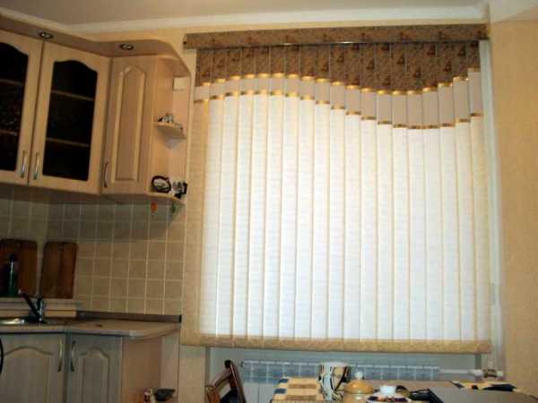 - Вертикальные жалюзи на кухню. В большинстве случаев это тканевые жалюзи на кухню, и выбирать их нужно осторожно – несмотря на то, что практически все разновидности этих изделий проходят антистатическую обработку, все же они в большей степени притягивают пыль и грязь, чем стандартные горизонтальные жалюзи. Выбирать для кухни нужно жалюзи с виниловым покрытием – они достаточно хорошо моются, да и грязь в них практически не впитывается. Если говорить о недостатках подобного вида жалюзи, то здесь можно отметить их место установки – на стекло, а вернее на оконную раму, их не повесишь. Как правило, они крепятся к верхнему откосу и, по сути, создают проблемы всему, что находится на подоконнике – не беда, если он не используется, а вот если он является частью столешницы, то здесь уже возникнут некоторые неудобства.