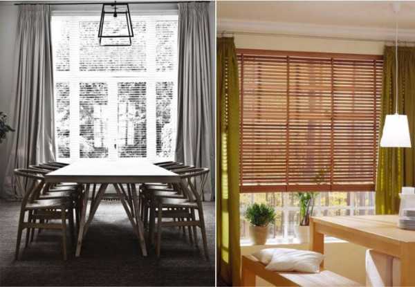Если есть желание, можно комбинировать жалюзи вместе с обычными шторами: так помещение будет выглядеть живее и интереснее.