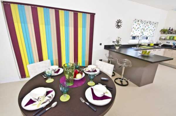 Вертикальные же жалюзи — это своеобразные шторы, у которых планки свисают сверху вниз. Изготавливаются они лишь из стекловолокна или ткани. Открываются как обычные шторы (в одну, другую или обе стороны). К преимуществам данного вида жалюзи можно отнести их презентабельный внешний вид. К тому же, они отличаются хорошим качеством и долговечностью. Вертикальные жалюзи на кухню вы можете посмотреть ниже в следующих фото.