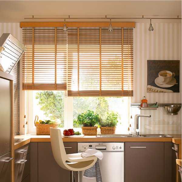 - Деревянные жалюзи. Не очень хороший вариант для кухни, но, тем не менее, многие люди отдают предпочтение именно им в силу натуральности этого материала. Служат они, как правило, не очень долго, так как древесина является капризным материалом в плане воздействия на нее изменений влажности.