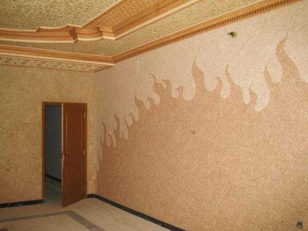 Довольно часто при производстве описываемого декоративного материала используются древесные волокна. С помощью такого покрытия можно добиться формирования слоя, который будет обладать звуко- и теплоизоляционными свойствами. Поверхность не теряет способности дышать, не покрывается плесенью и отличается дешевизной. Компоненты характеризуются экологической безвредностью, а также эстетичностью и декоративностью.