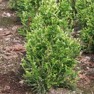 Хвоя блестящая, чешуевидная, плоская, плотно прилегающая к побегам, тёмно-зелёного цвета. Молодые приросты золотисто-желтого цвета. В зимний период цвет хвои не меняет. Корневая система поверхностная. Побеги густые, с возрастом уплотняются, направлены вверх.