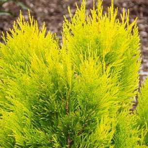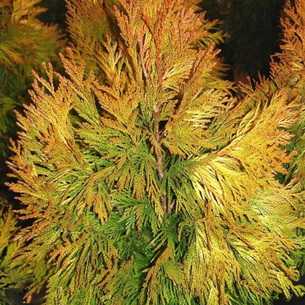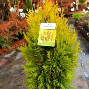 Говоря о золотистых сортах, в первую очередь стоит вспомнить Тую западную’ Lutea’ (Thuja occidentalis ‘Lutea’), сорт известный в США под именем ‘Gеоrgе Реаbоdy’, это один из самых красивых и старинных сортов, возникший в Женеве до 1873 года. Имеет стройную пирамидальную крону и крупные плоские веточки. Улучшив его в 1960 году в Боскопе (Голландия) был создан сорт ‘Sunkist’. Это скорее крупный конусовидный кустарник, чем дерево. Его ветви очень декоративны, густые, слегка закрученные с ярко-золотистой хвоей летом и бронзой – зимой. Это теневыносливый сорт, хотя в тени его хвоя и становится зеленее.