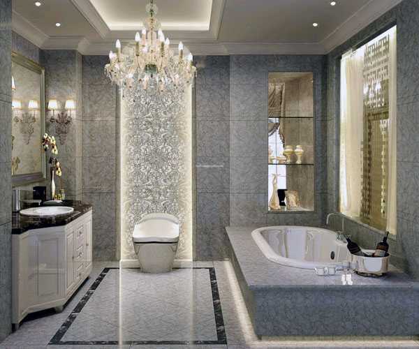 Мы не можем говорить о дизайне ванной комнаты без упоминания соответствующего способа освещения. Освещение поставляется в самых разных вариантах: настенные бра, люстры, светодиодное освещение, естественный свет, потолочные светильники и т.д. Как и любой другой элемент концепции дизайна, потолочные светильники для ванной комнаты очень важны для появления ванной и гармоничной атмосферой. Выбор правильного светильника для ванной комнаты будет зависеть от стиля дизайна. Вы можете выбрать хрустальную люстру, которая улучшит дизайн потолка и сделает ее выдающейся. Современные потолочные конструкции ванной комнаты имеют удивительные сочетания между встроенным светодиодным освещением и утопленным освещением.