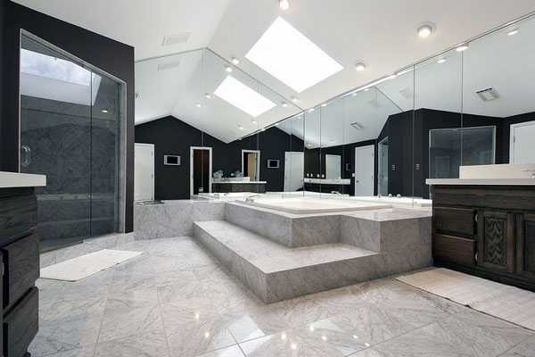 В случае, когда налажен процесс уборки и помещение ванной комнаты достаточно большое, можно смело использовать зеркала в качестве оформление потолков, чтобы зрительно увеличить их высоту и создать атмосферу роскоши и пафоса.