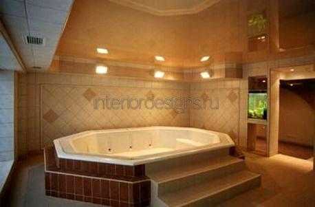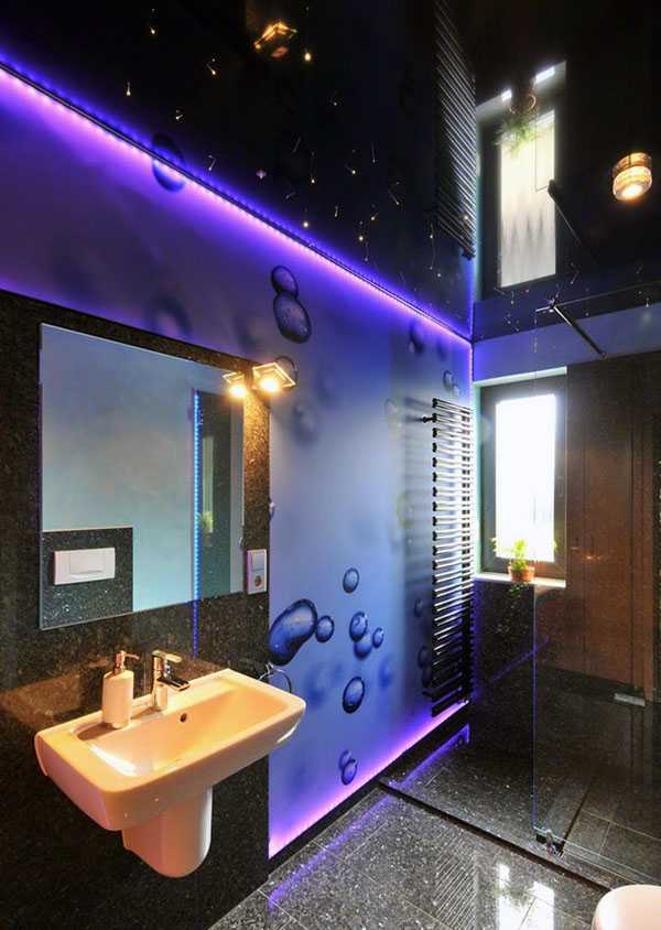 Глянцевые натяжные потолки светлых оттенков визуально увеличат пространство небольших ванных комнат. Для больших ванных рекомендуется устанавливать натяжные потолки темных цветов.