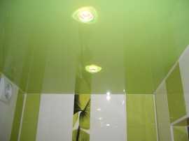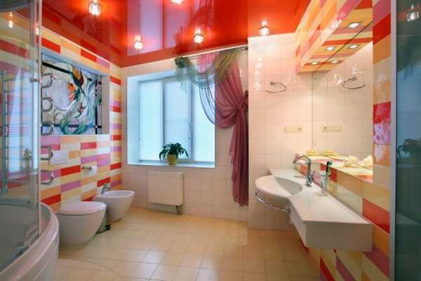 Такой цветной потолок в ванной (как собственно и белый) гармонирует практически со всеми стеновыми решениями, в помещениях любого размера и любой геометрической формы.