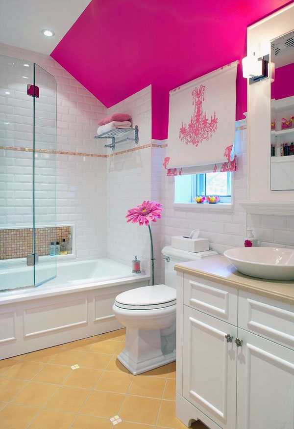 Окрашенные потолки как визуальный акцент в интерьере ванной комнаты.