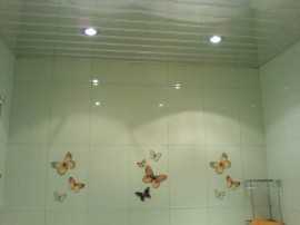 Накладные реечные потолки- Накладные декоративные потолки. Этот вид потолка очень прост в монтаже, имеет достаточно много возможностей для реализации формы и расцветки. В накладных потолках применяются самые различные тепло- и влагостойкие материалы с минимальным поглощением водяного пара, неизбежно появляющегося при эксплуатации ванной комнаты. Особое внимание необходимо уделять герметичности покрытия, возможно проведение гидроизоляционных мероприятий на поверхности основного потока с помощью проникающих цементных или полимерных смесей. При монтаже накладных потолков можно использовать готовые комплекты потолков для ванных комнат, применяющиеся в типовой застройке с очень небольшими доработками под конкретное помещение;