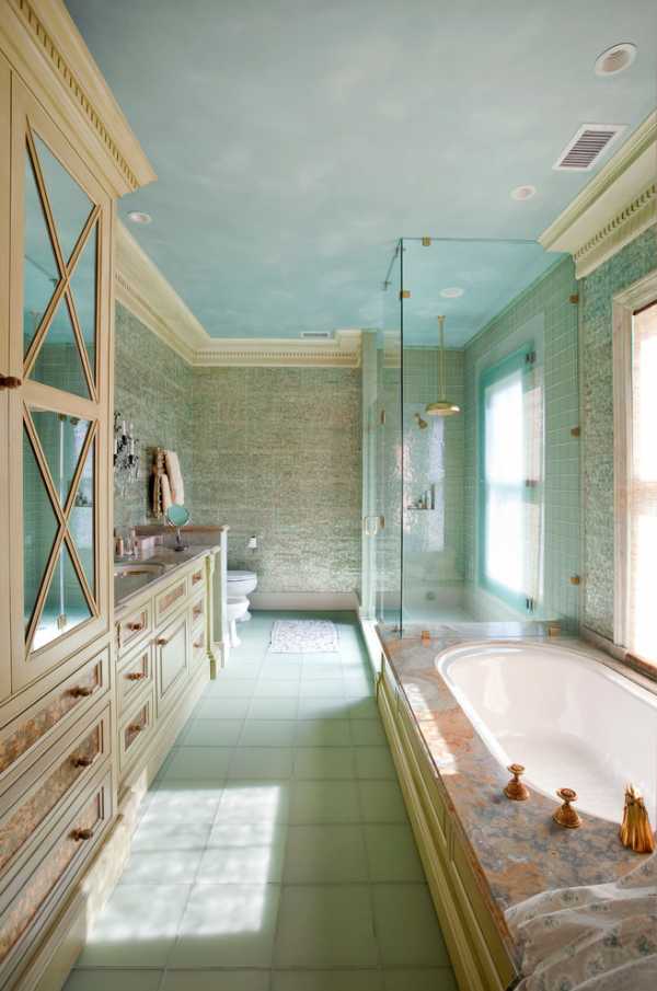 Отдельно нужно выделить довольно интересное сочетание голубого и зелёного. Ванна, выполненная в этих цветах, отдаёт морской свежестью.
