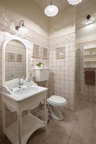 Белая гладь особо удачно гармонирует с классической сантехникой, подчёркивая идеальную чистоту подобных помещений.