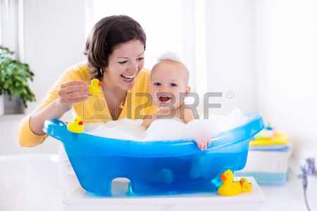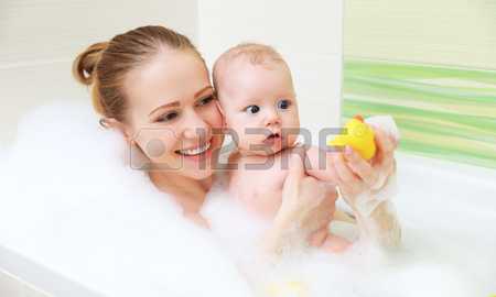 #56545439 — Happy baby taking a bath playing with foam bubbles. Mother washing..