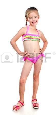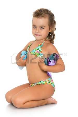 #52594388 — Beautiful little tanned girl in a bathing suit, hugging hands,..