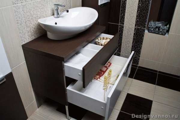 Врезные умывальники для ванной с тумбочкой удерживаются самой столешницей, при этом сама чаша такой раковины может быть установлена сверху или встроена в отверстие. Самый ответственный этап — правильно определить габариты тумбы и выбрать место.
