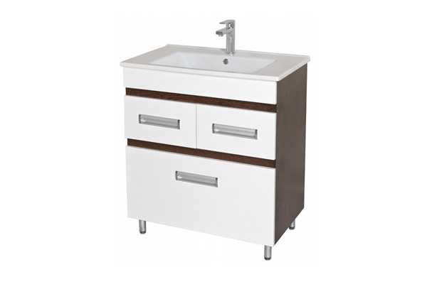 Очень популярны умывальники с тумбами с цоколем. Но можно сразу отметить, что такая разновидность тумб весьма неудобна, несмотря на привлекательный и стильный внешний вид. Тумба с цоколем устанавливается вплотную к стенам и не имеет ножек, а значит стоит плотно на полу. Со временем, контактируя с водой, любой материал начинает портиться, что неизбежно и для тумб, которые изготавливаются из ДСП или МДФ.