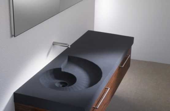 Великолепной изюминкой в модернизированном, футуристичном стильном интерьере станет умывальник в ванную комнату в виде изогнутой раковины. Несмотря на то, что такое нестандартное решение не отличается особой практичностью, эксцентричность и уникальность формы делает раковину главенствующим декоративным элементом модного дизайна интерьера.
