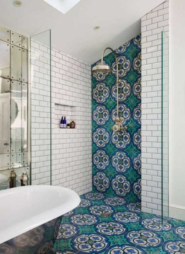 - Напольное покрытие. Если ванная маленькая, пёстрые мозаики на стенах могут смотреться слишком ярко, однако подобный декор на полу будет хорошо выглядеть даже на небольшой площади.