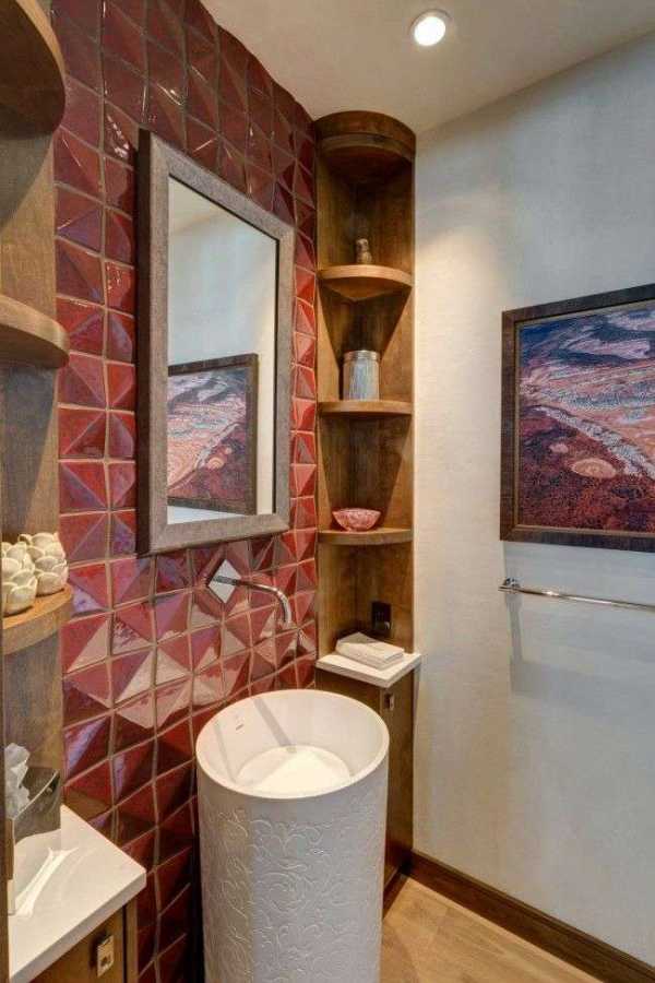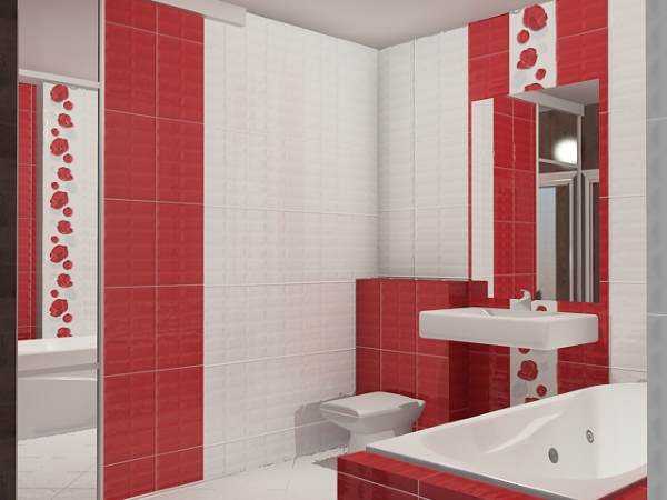 Рельефная красная плитка с глянцевой поверхностью смотрится очень эффектно в помещении ванной комнатыУстойчивость к бытовой химии